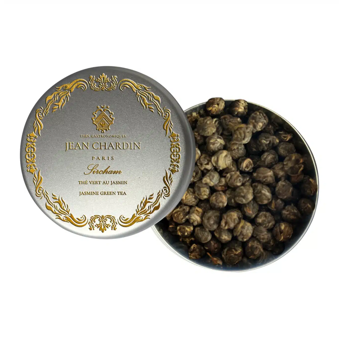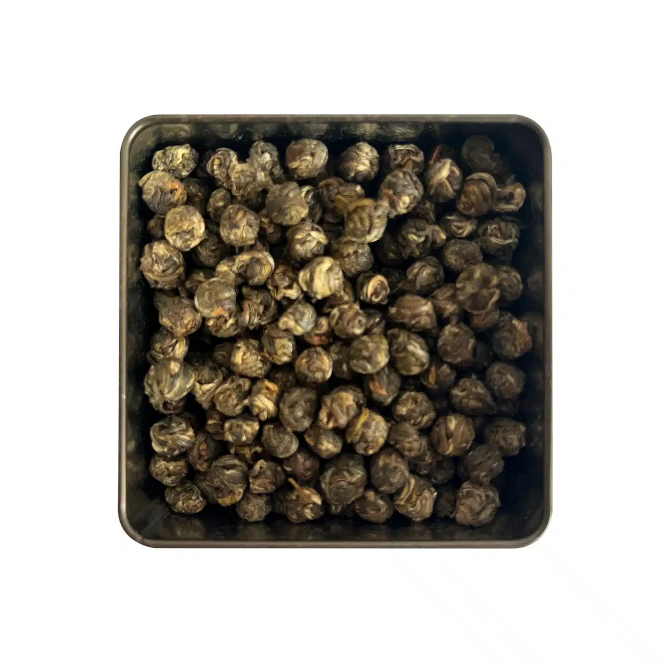 Véritable thé au jasmin parfumé par enflorage traditionnel puis roulé en perles. Floral, élégant et délicat, offrant une liqueur douce et plusieurs infusions sans amertume.